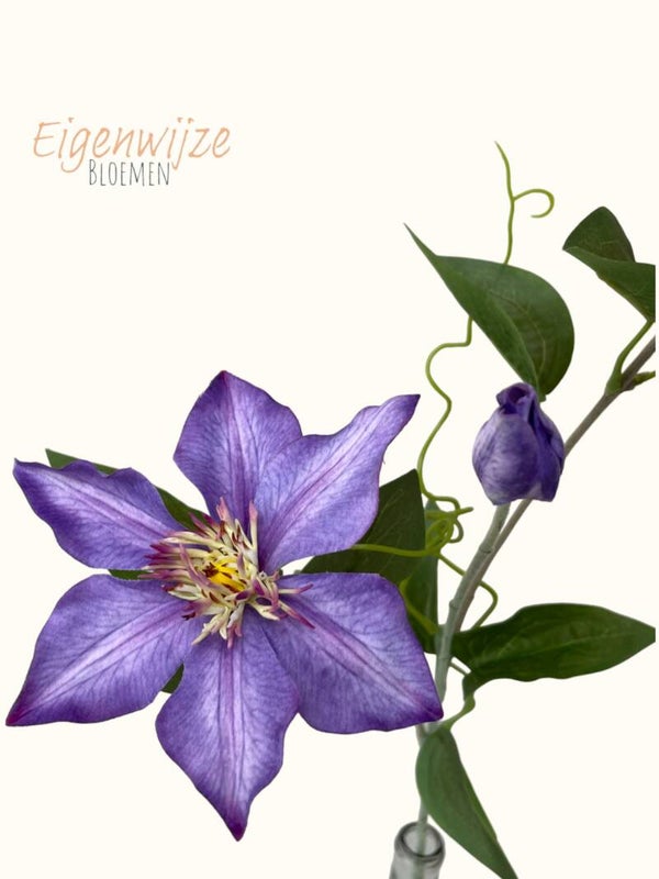 Prachtige Clematis paars met 2 bloemen en een knop. Hoogte 76 cmBloemknop 13 cm en 12 cm